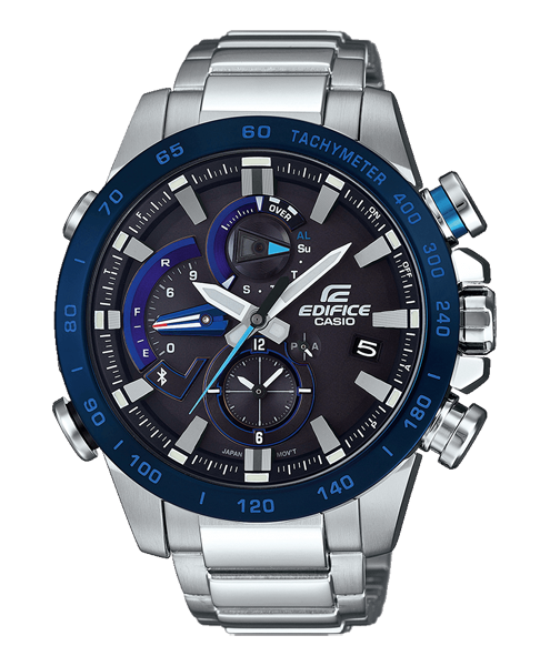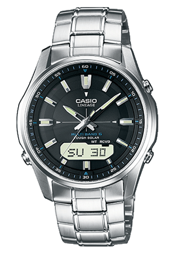 Saphirglas, Solarbetrieb, Neo-Display, Stoppfunktion, Tagesalarme, automatischer Kalender, massives Edelstahlgehäuse, massives Edelstahl-Armband, Sicherheitsschließe, Ladekontrollanzeige, Wasserdichtigkeits-Klassifizierung (5 Bar)